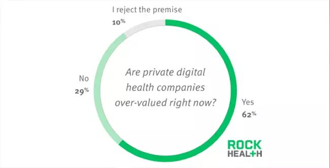 当问及“您认为当下对私人数字医疗公司的估值是否过高?”这样的问题时,答案是出人意料的。大部分与会者对这个问题持肯定态度。准确地说,62%的投资者认为对私人数字医疗公司的估值过高;而只有29%的投资者认为并非如此。