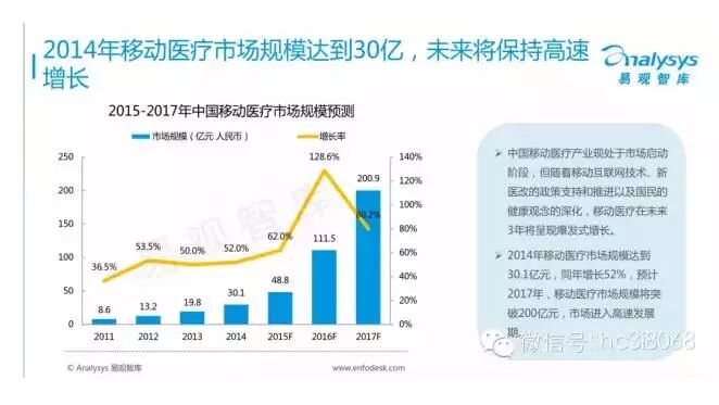 然而即使面临这些问题,仍然挡不住投资者和创业者的热钱和热情,从去年至今,已有2000余款APP上线,从健康管理到在线咨询、从上门送药到线上挂号、从比价团购到智能硬件无所不包,仅2014年市场规模便高达30亿元,预计2017年将高达200亿元。