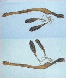 【生药材鉴定】:海狗肾药材来源不一,商品复杂,一般所用进口海狗肾(品种未定)为干燥的阴茎及睾丸。阴茎里长圆枚形,先端较细,长28~32厘米,干缩有不规则的纵海及凹槽,有一条纵向的筋。外表黄棕色或黄色,杂有褐色斑块。后端有一长圆形、干瘪的囊状物,约4 x3厘米,或有黄褐色毛。睾丸二枚,扁长圆形,棕褐色,半透明,各有一条细长的输精管与阴茎末端相连。输精管黄色、半透明,通常缠绕在阴茎上。副睾皱缩,附在睾丸的一侧,乳黄色。以形粗长,质油润,半透明,无腥臭者为佳。 |
