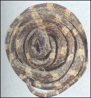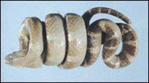 小白花蛇:又名金钱白花蛇、花蛇、小花蛇、百节蛇、银环蛇、金钱蛇、金钱蕲蛇。为眼镜蛇科银环蛇(银报应、寸白蛇、白菊花、断肌甲、多条金甲带、百节蛇、白节蛇、手巾蛇)Bungarus multicinctus Blyth的幼蛇。除去内脏,盘成圆形如钱大。功效与白花蛇相似,但用量较轻。主产于广东、广西等地。非白花蛇正品。以头尾齐全、干燥、色泽明亮、盘小者为佳。